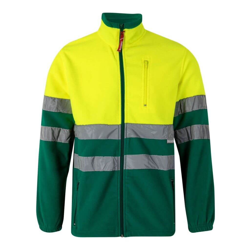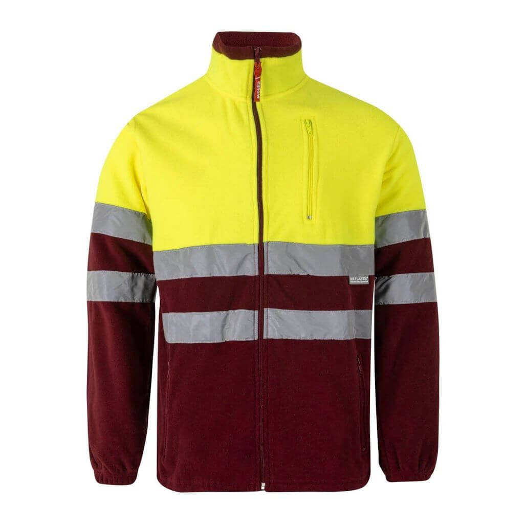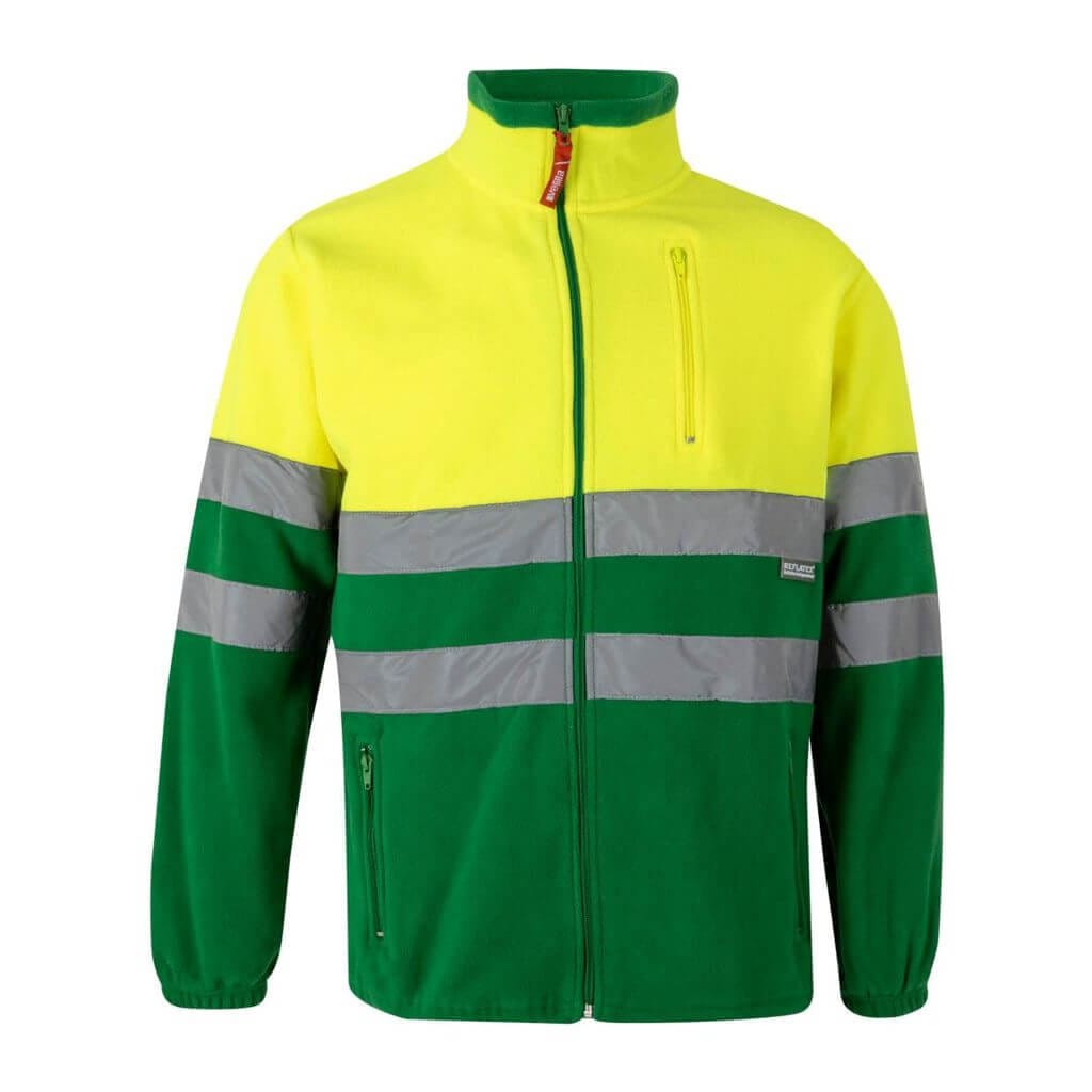 Chaqueta polar bicolor de alta visibilidad con cintas reflectantes en torso y mangas, diseño funcional para entornos de trabajo exterior.Disponible en webshop