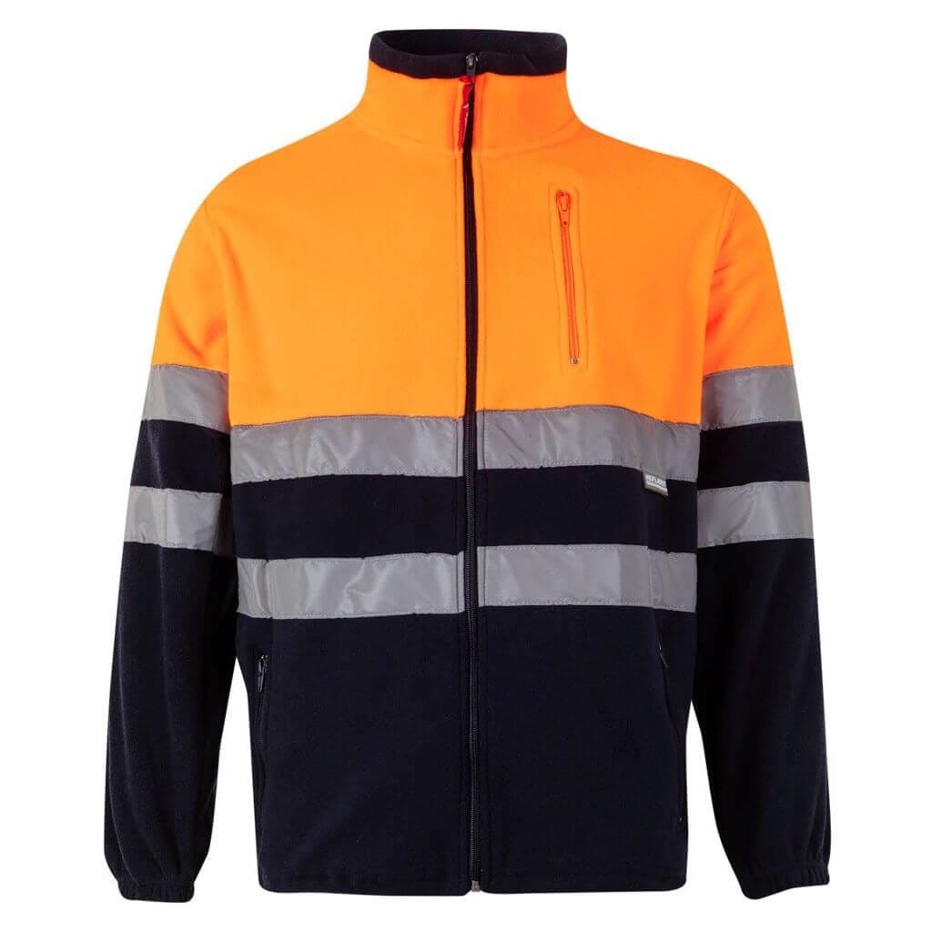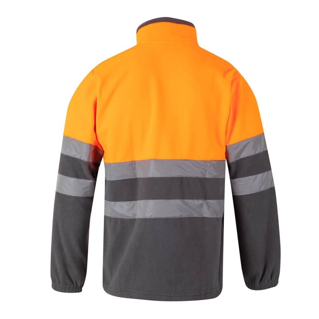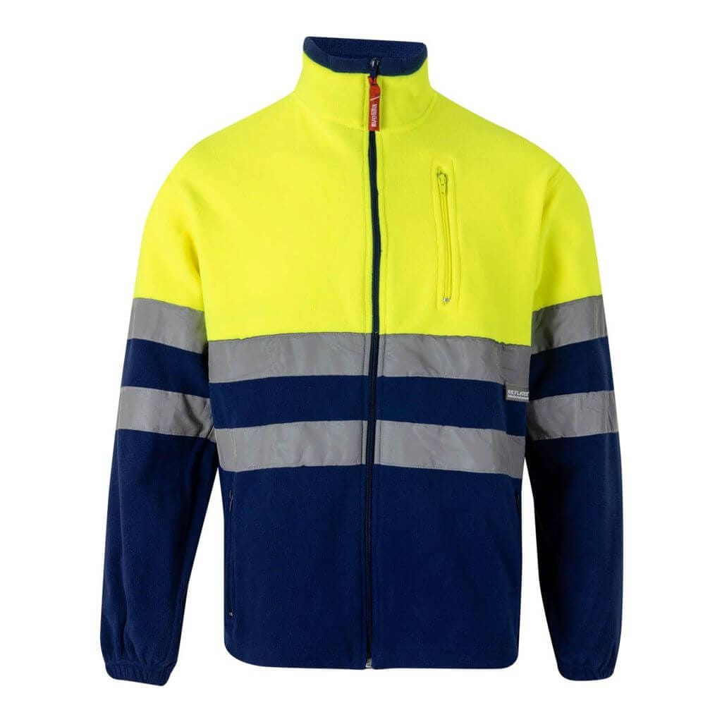 Chaqueta polar bicolor de alta visibilidad con cintas reflectantes en torso y mangas, diseño funcional para entornos de trabajo exterior.Disponible en webshop