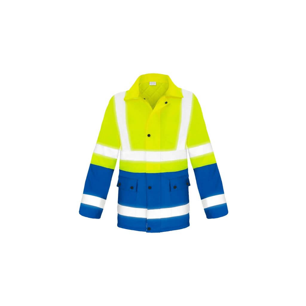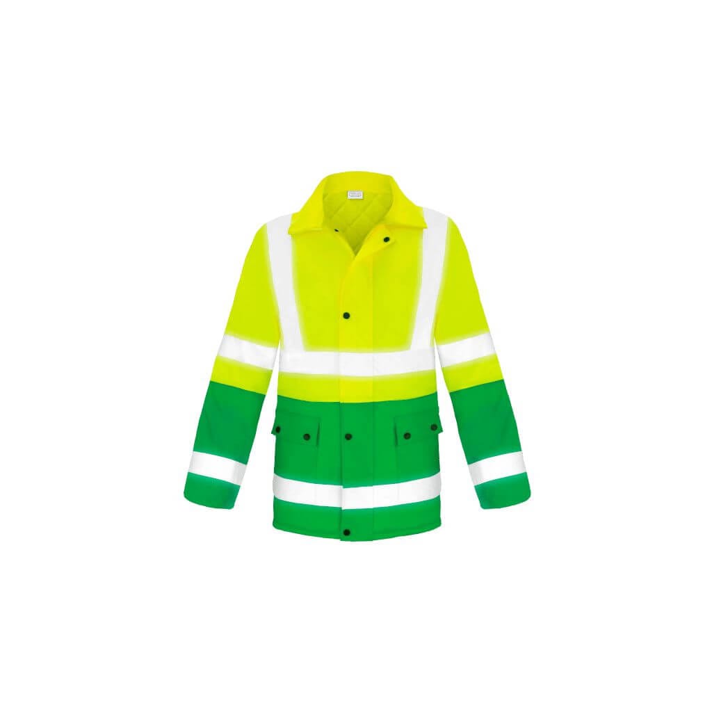 Parka impermeable de alta visibilidad con bandas reflectantes, tejido externo de poliéster 245 g/m² y diseño funcional para trabajos en exteriores.Disponible en webshop